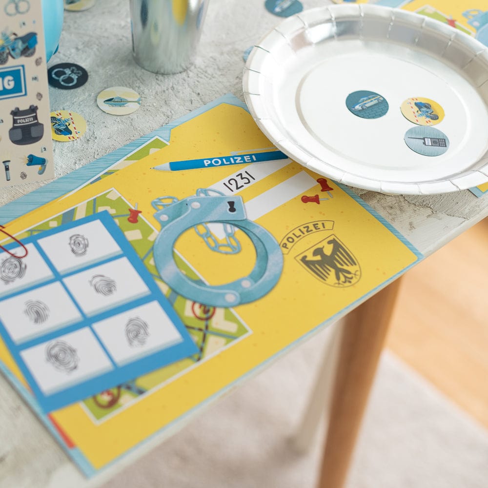 Die Kinder kommen als Polizisten und bekommen direkt eine Polizeimarke (zum Beispiel aus Papier oder als Sticker).